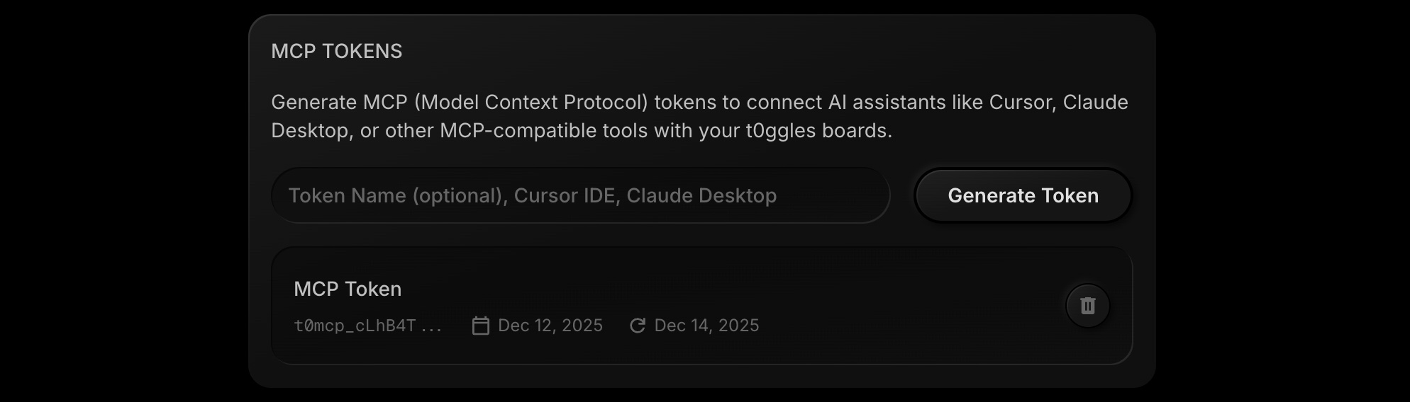 MCP (Model Context Protocol) tokens allow AI assistants like Cursor, Claude, VS Code, and other MCP-compatible tools to securely access your t0ggles boards and data. This guide explains how to generate, manage, and secure your MCP tokens.