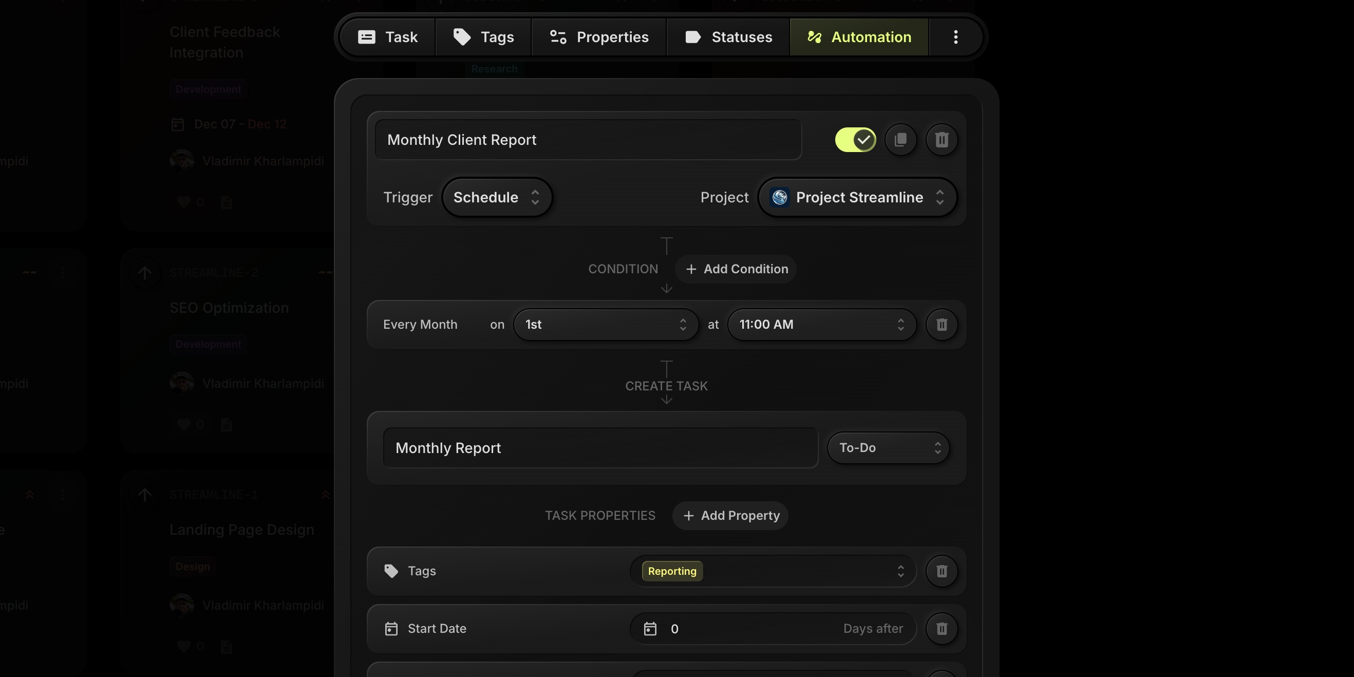 Automatically create a Monthly Client Report task in a specific project on the 1st of every month, with: