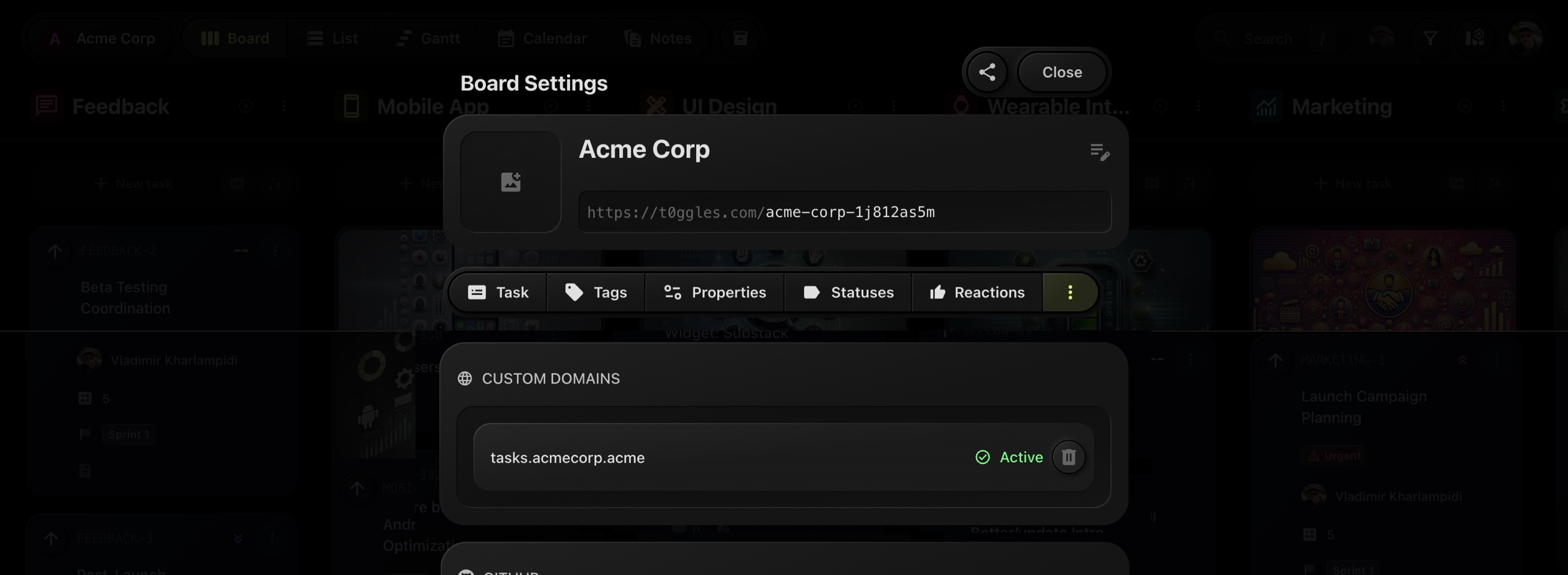 Link your board to your own domain so teammates and clients can open it at a branded URL (e.g., tasks.mycompany.com). Once connected, the board is served over HTTPS and can use your board image for branding (auth screen, favicon, and meta preview).