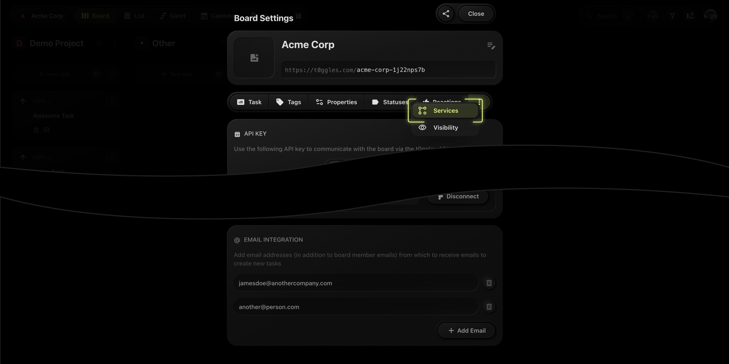 Each project in a t0ggles board has a unique email address. The format is: