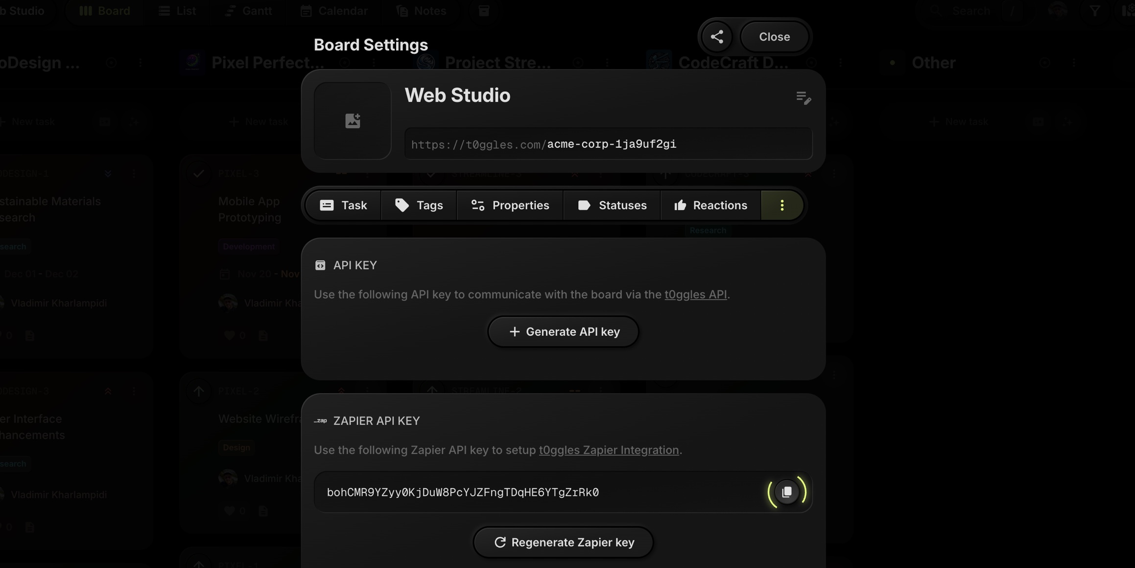 Only board owners can generate Zapier API keys. This key is used to authenticate your t0ggles board with Zapier.
