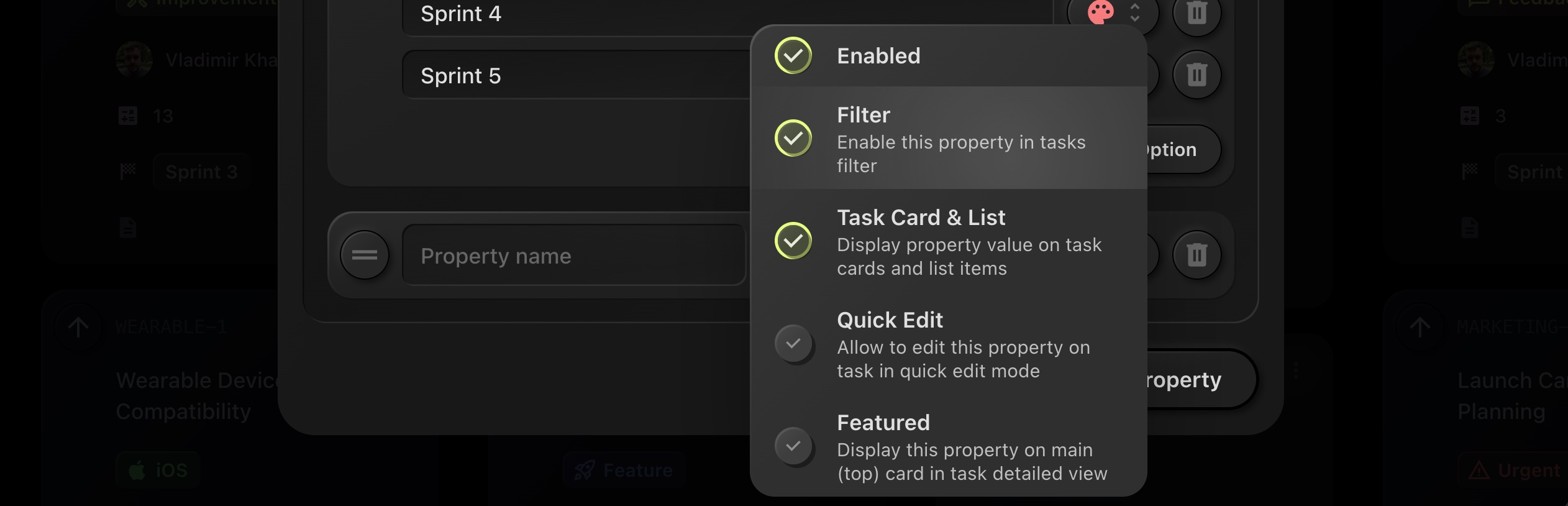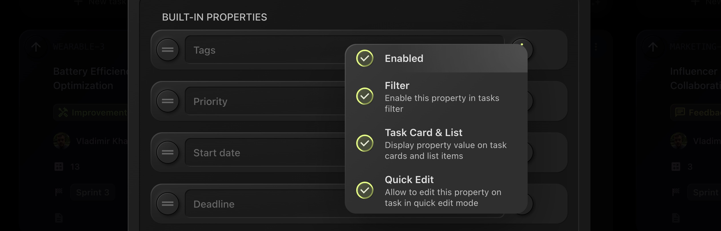 You can also customize which properties appear on task cards, lists, and filter views, as well as configure Quick Edit and Featured options: