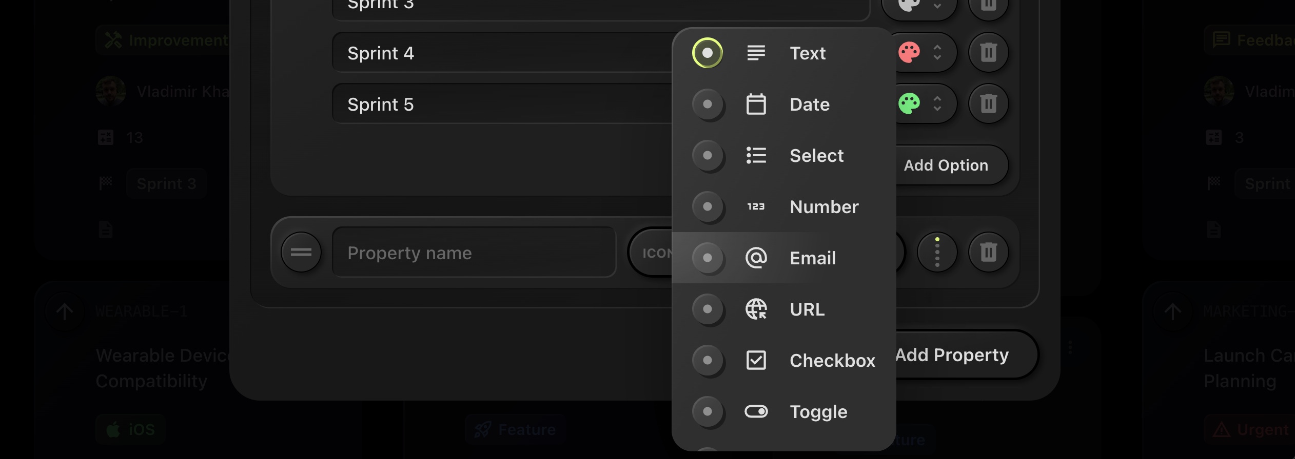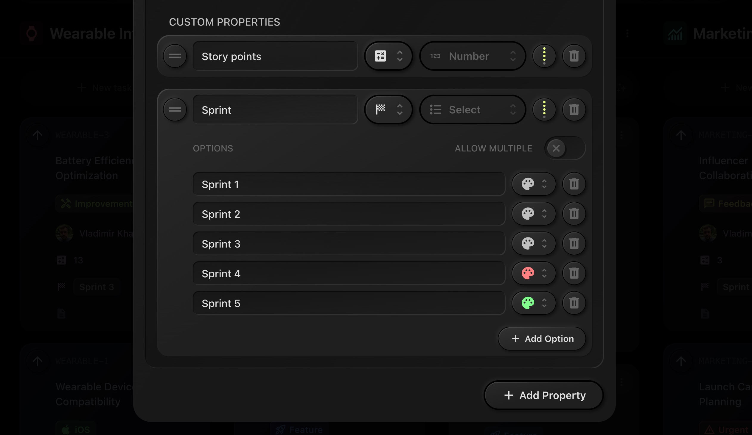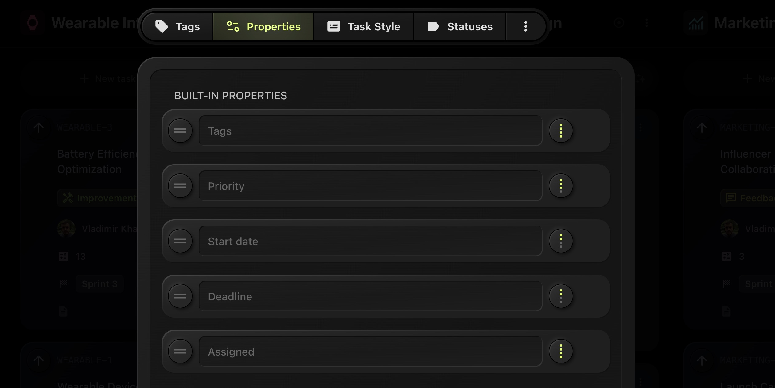 The Board Properties (also known as custom fields) allow you to define additional fields for tasks on the board, giving more flexibility in task management.