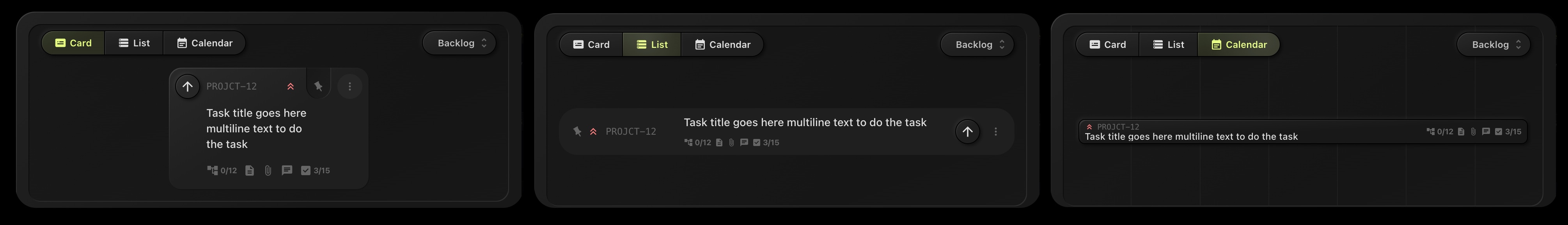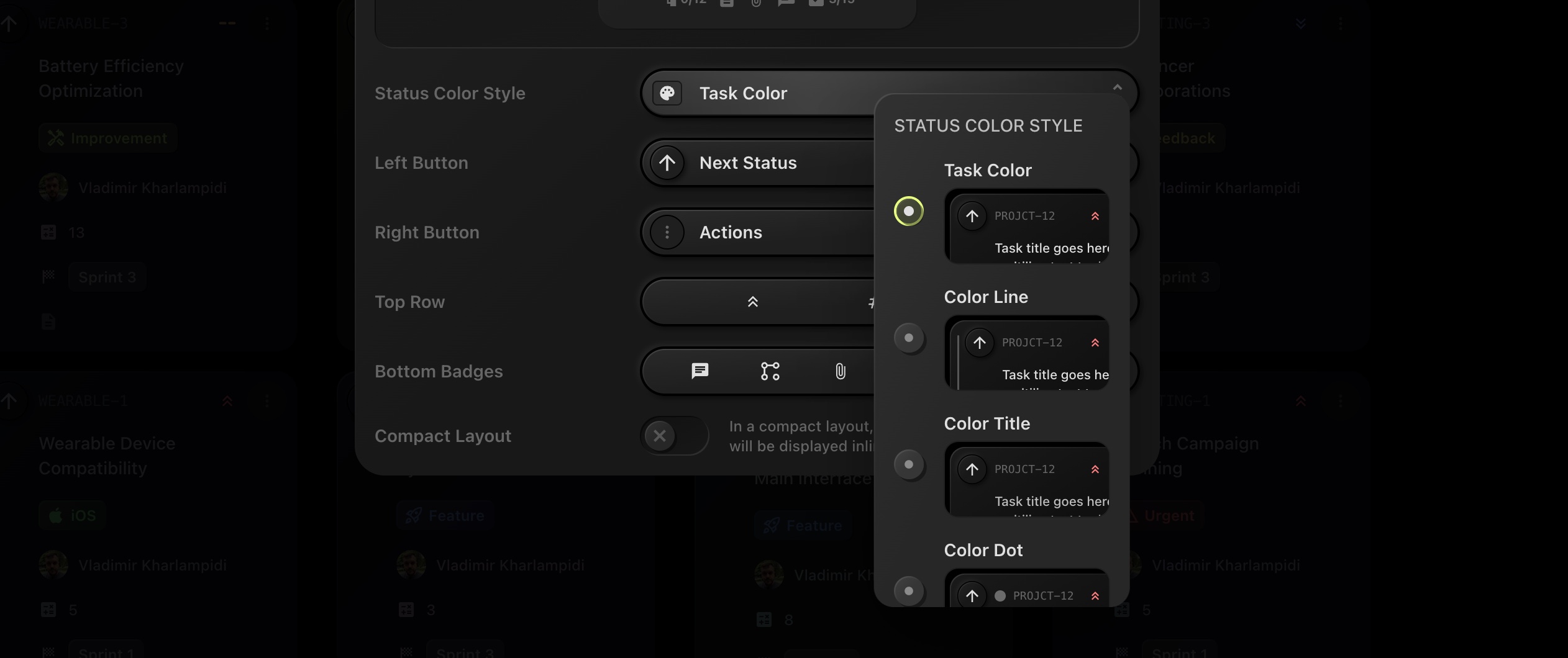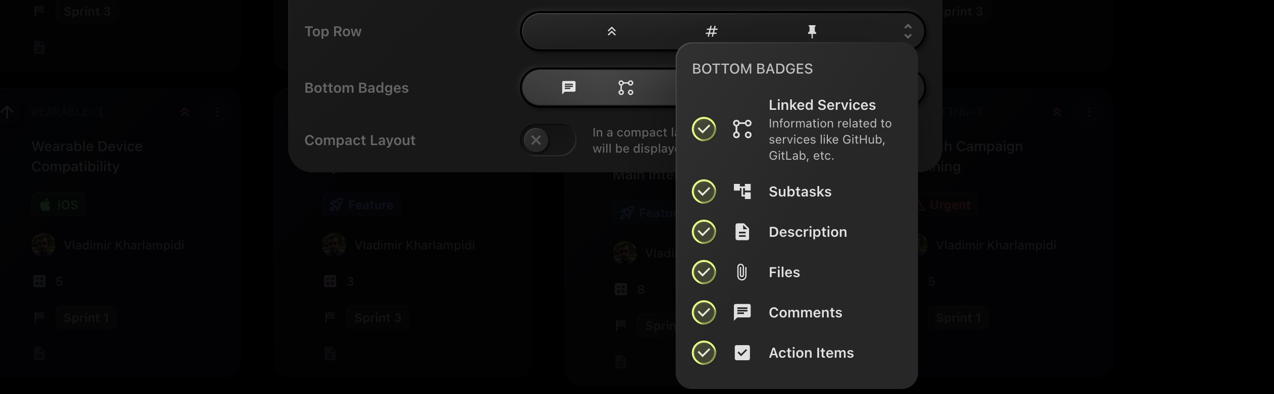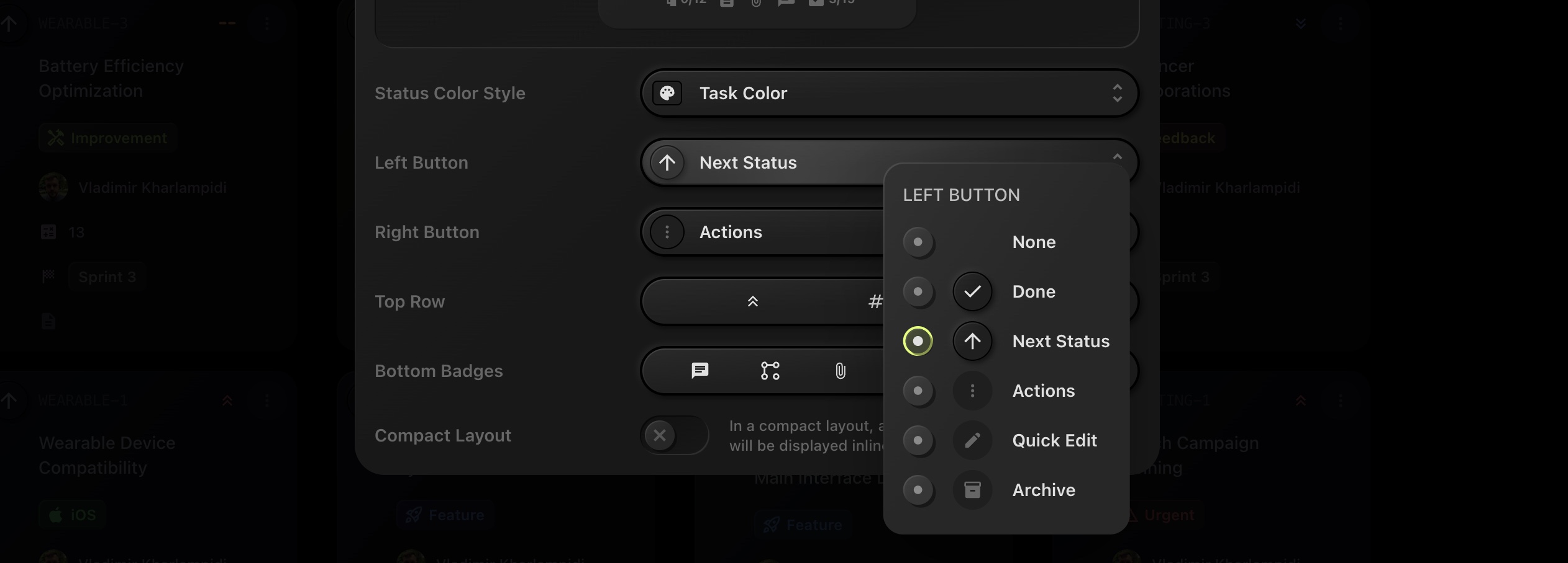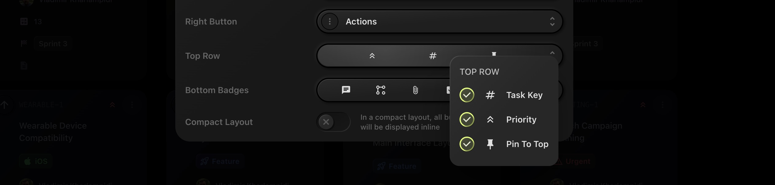 Toggles the compact layout for task cards. When enabled, it condenses the task card, showing all built-in and custom properties in a more inline and compressed format.