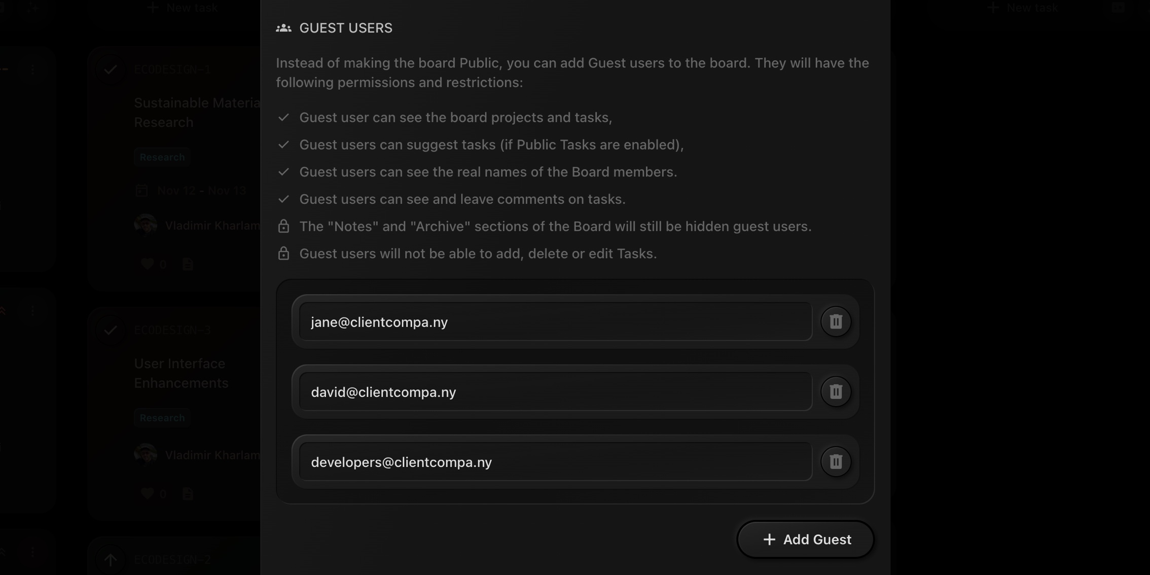 - The "Notes" and "Archive" sections of the Board will still be hidden for guest users.