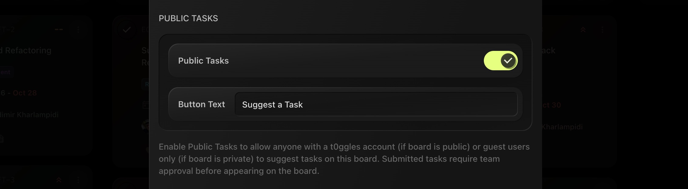 When Public Tasks are enabled, users with a t0ggles account (if board is public) or guest users (if board is private) can submit tasks to a board. These submissions require team approval before appearing on the board. This is useful for collecting feature requests, bug reports, or** general feedback** from external users.