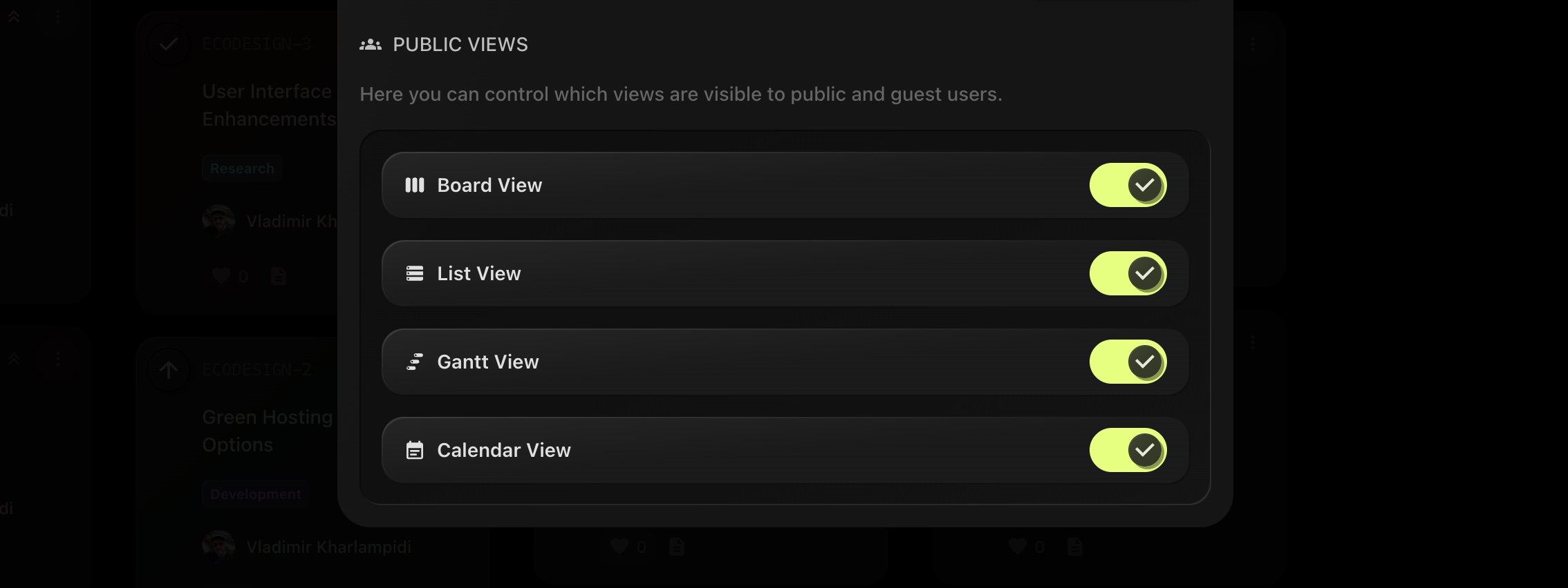- Board View: The Kanban board view will be visible to public and guest users.