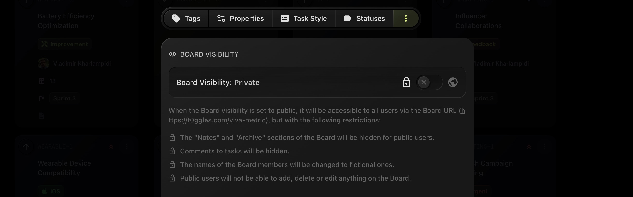 If you change the visibility to Public, the board becomes accessible to everyone via a public URL. However, several restrictions are automatically applied: