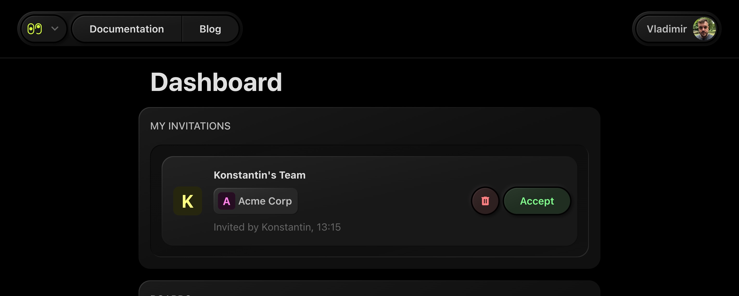 Invited users will receive an email notification about the invitation. They'll see your invite at the top of their dashboard, which they can accept or reject.