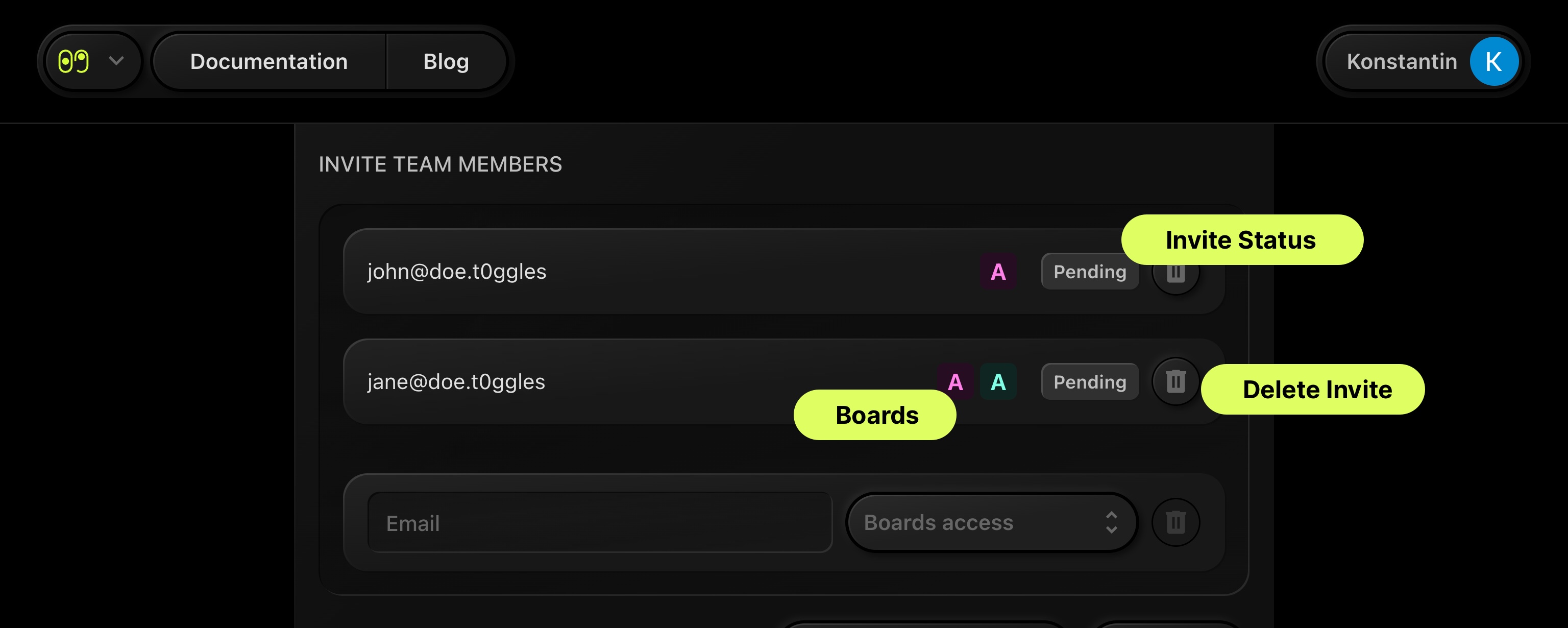 Send the Invite: Click the "Send" button. Pending invites will appear above, where you can view the boards they are invited to or cancel the invite if needed: