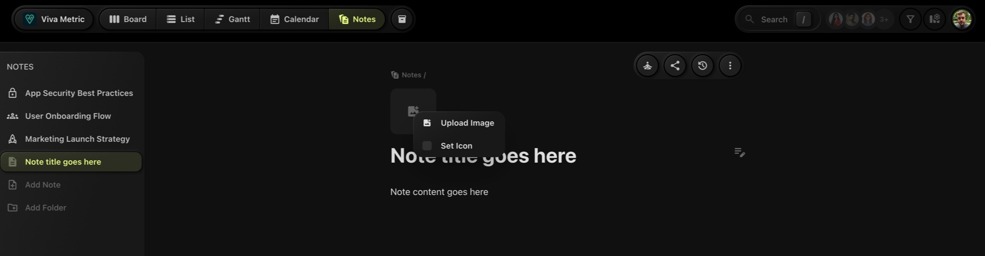 The Notes section in t0ggles is a powerful tool for creating, organizing, and managing all your important documentation. Whether you need to write down project ideas, document workflows, or outline strategies, the Notes feature provides a clean, rich-text editor for a seamless writing experience. Every note can include a unique image/icon, a descriptive title, and a full-text rich description to help teams stay organized and focused.