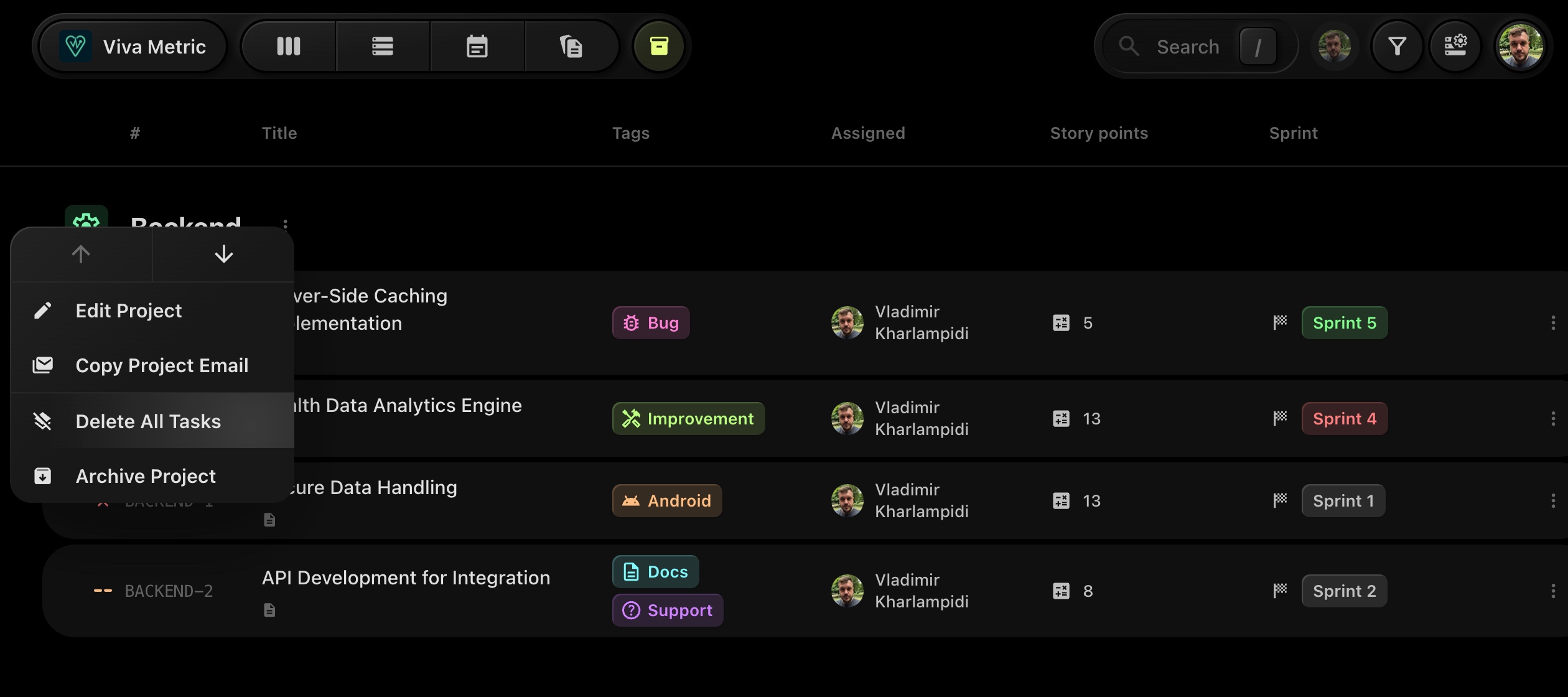 Open the Project Actions Menu: Next to the project from which you want to delete tasks, click on the three dots (...) to open the project actions modal.