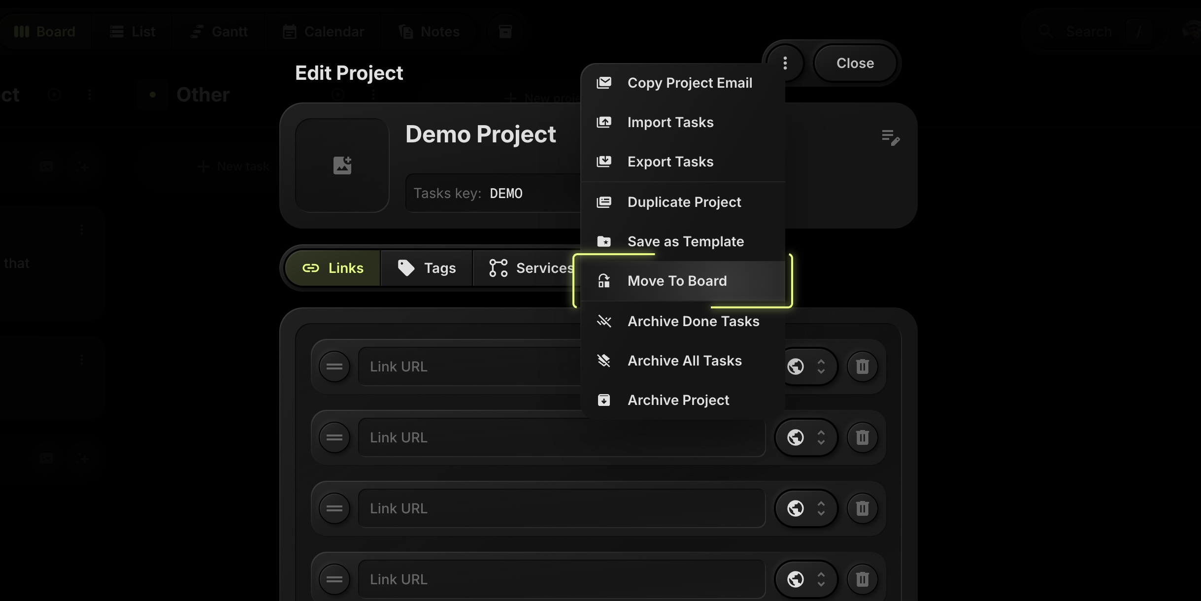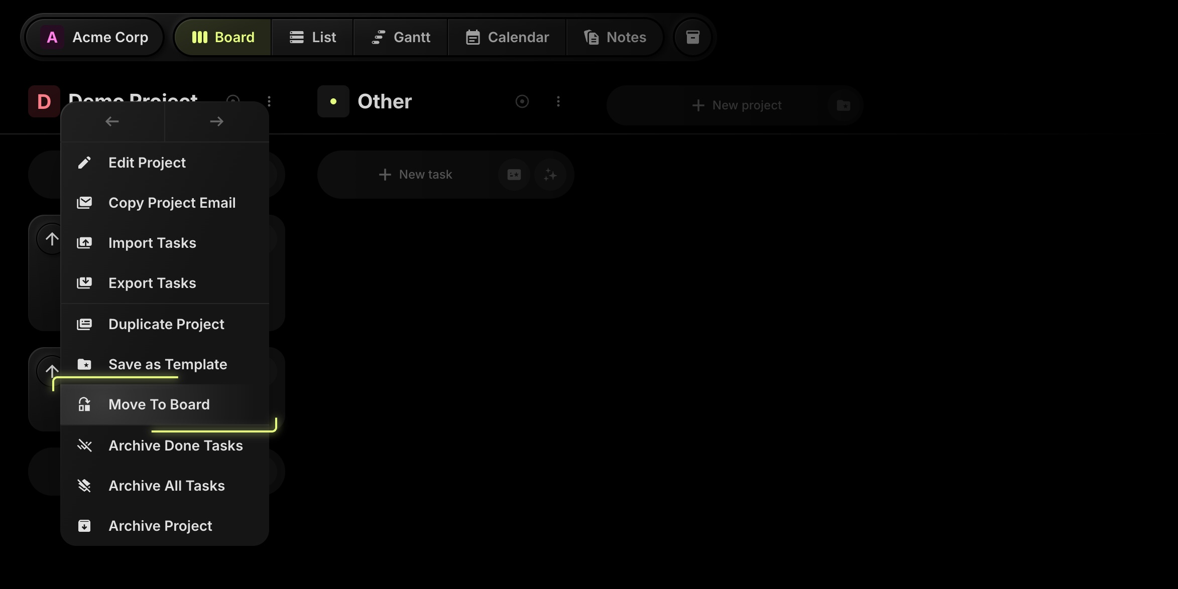 Use Move To Board from a project's menu, pick the destination board, then map Statuses, Tags, and Properties. Confirm, and your project - including all tasks and comments - arrives on the new board with the structure you chose.