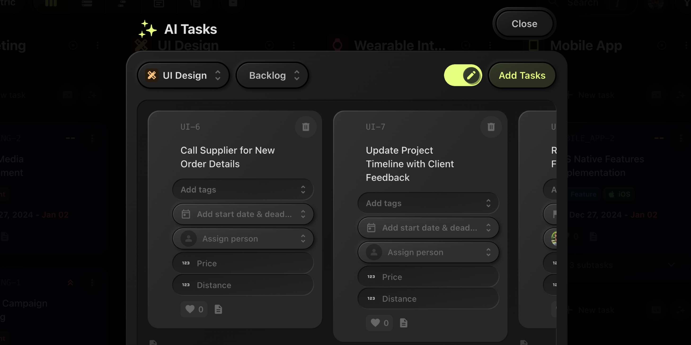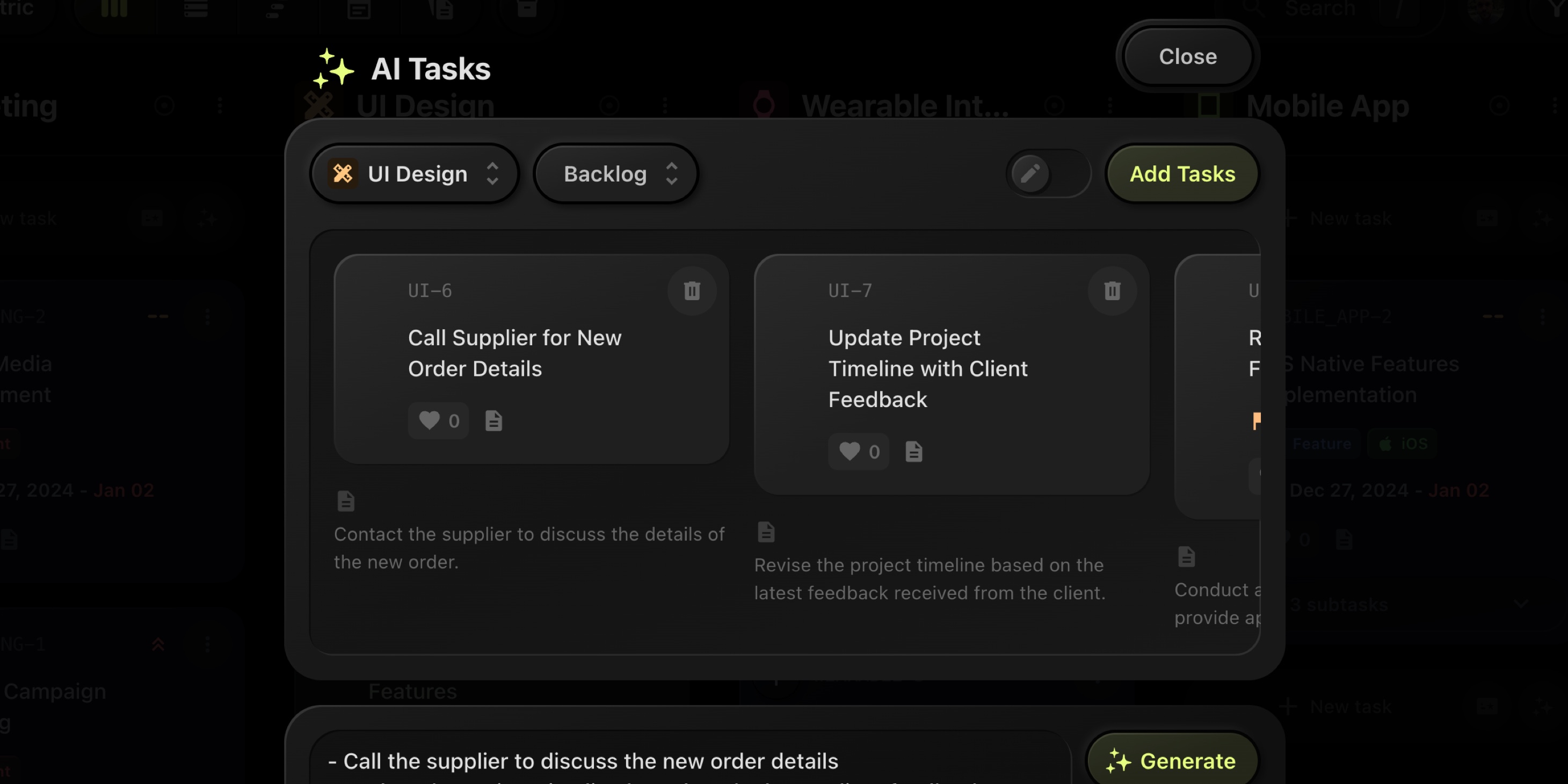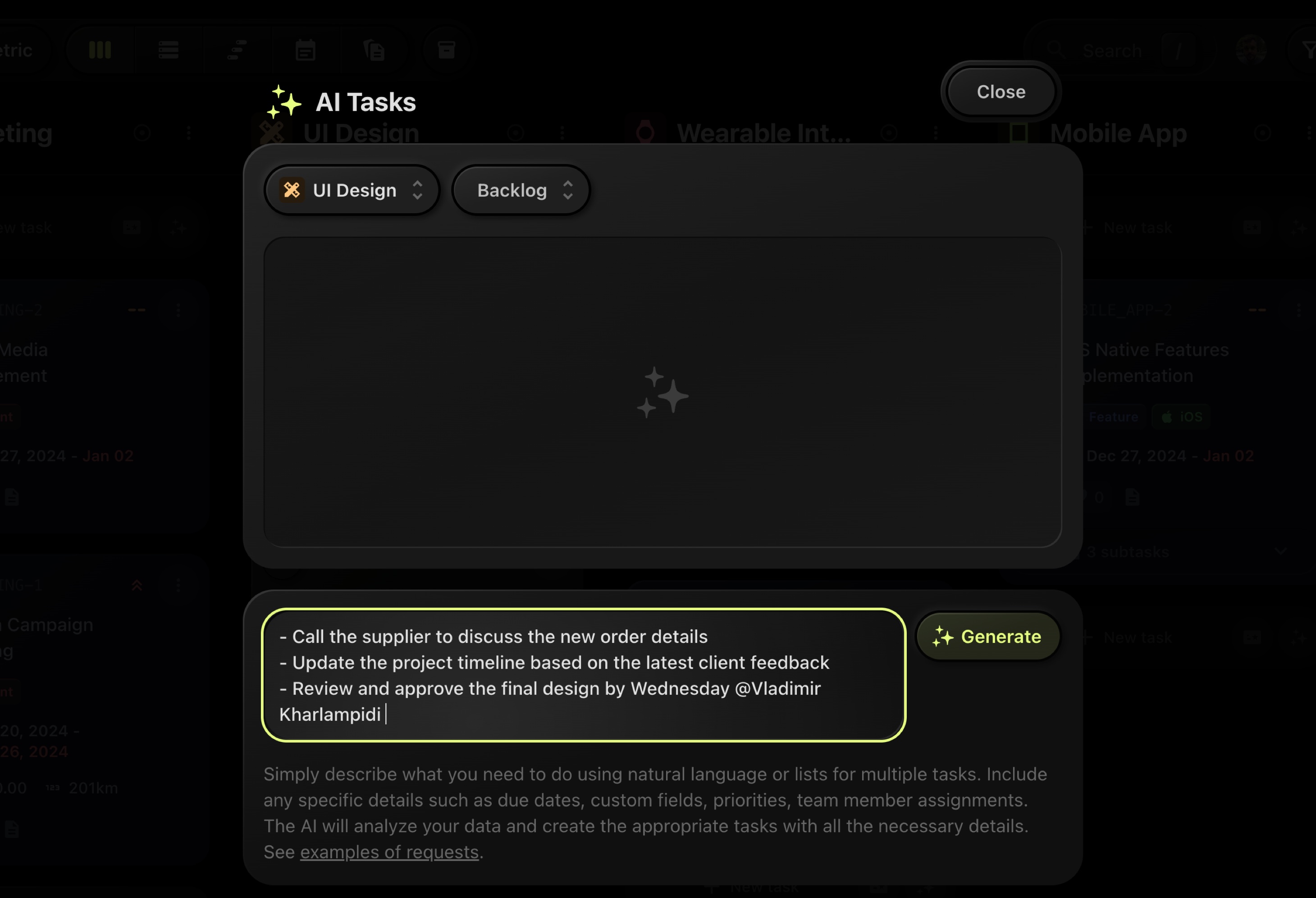 The AI will analyze your input and suggest task titles, descriptions, and properties.
