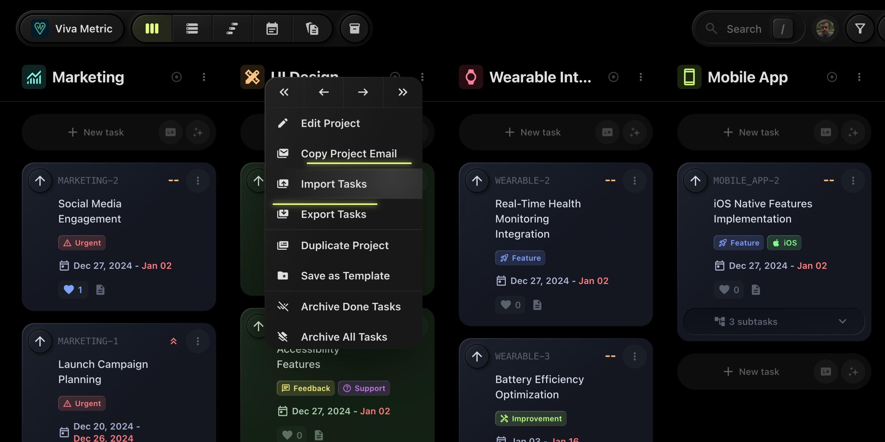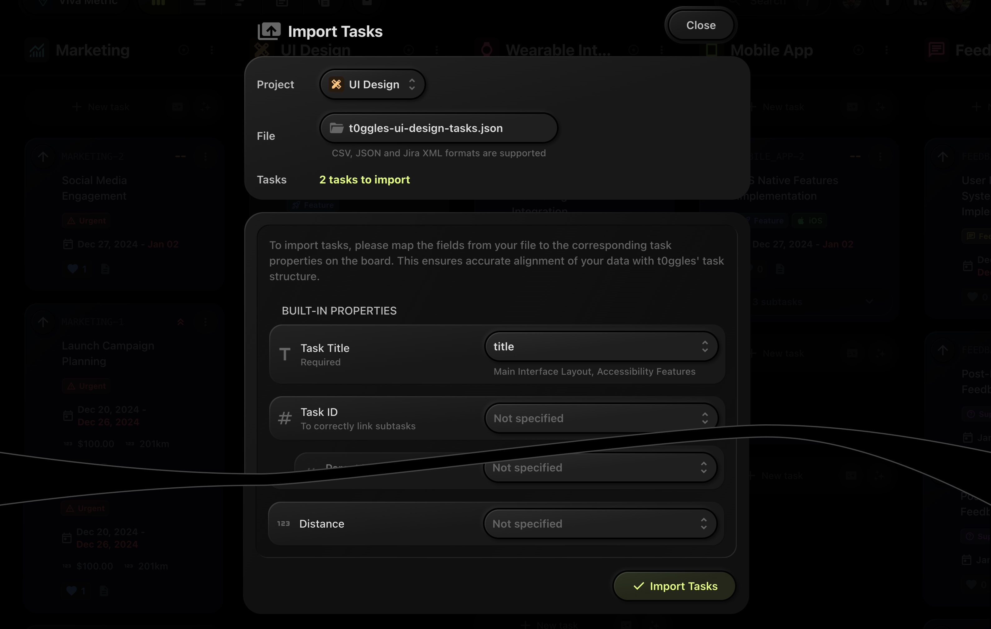 Easily import tasks from external files into your t0ggles boards. This feature helps quickly populate your boards with tasks from other systems or previous projects.