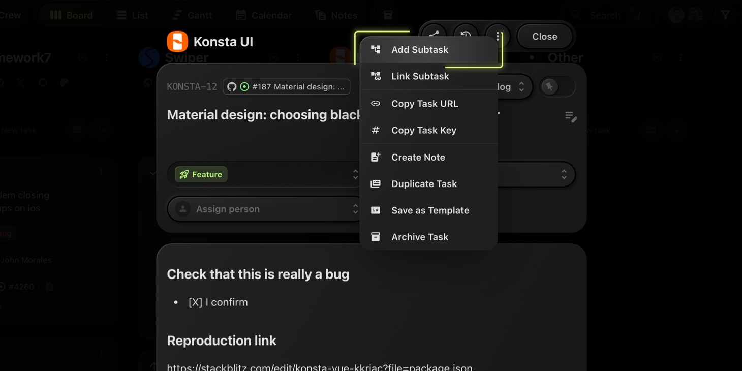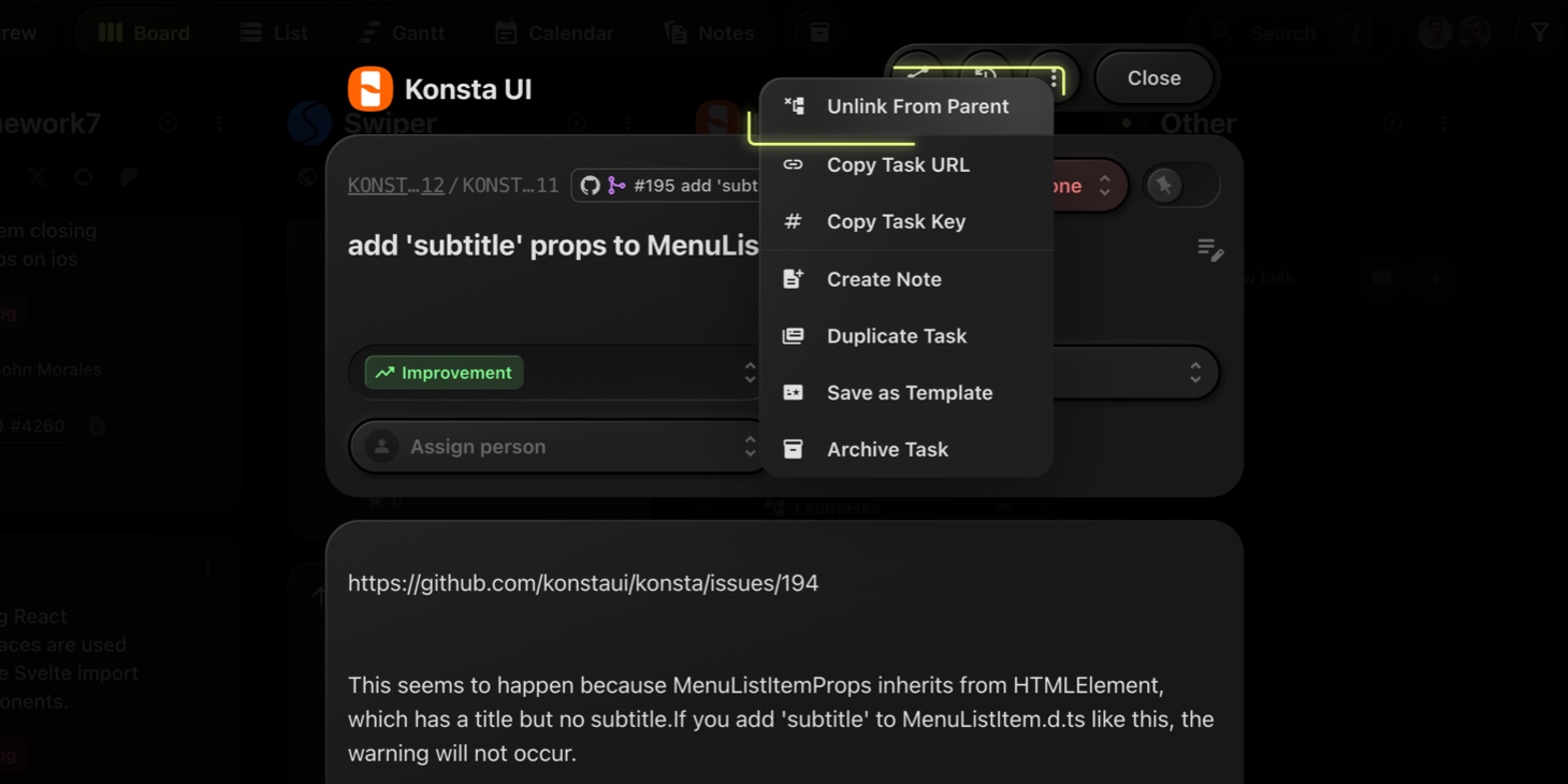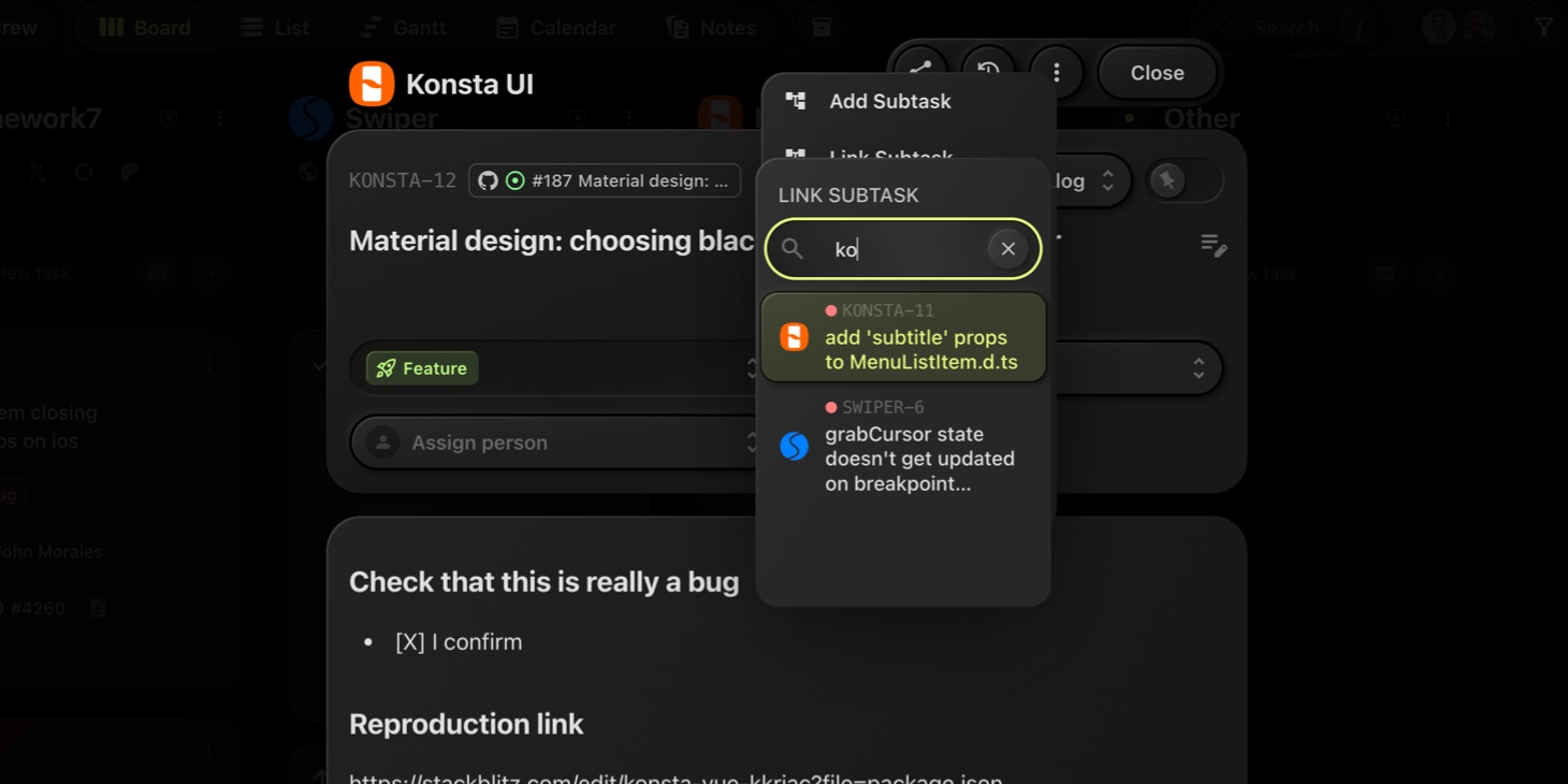 The selected task is now linked as a subtask.