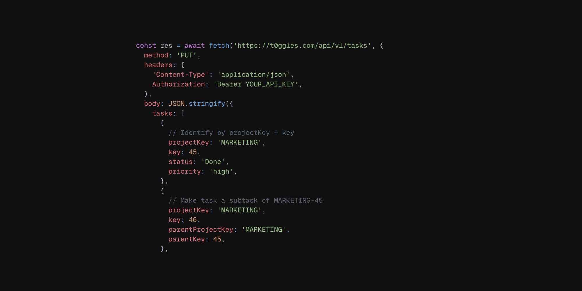 const res = await fetch('https://t0ggles.com/api/v1/tasks', {method: 'PUT',headers: {'Content-Type': 'application/json',Authorization: 'Bearer YOUR_API_KEY',},body: JSON.stringify({tasks: [{// Identify by projectKey + keyprojectKey: 'MARKETING',key: 45,status: 'Done',priority: 'high',},{// Make task a subtask of MARKETING-45projectKey: 'MARKETING',key: 46,parentProjectKey: 'MARKETING',parentKey: 45,},{// Identify by ID and update multiple fieldsid: 'task789',title: 'Updated Campaign Title',assignedUserEmail: 'alex@company.com',tags: ['Urgent', 'Q1 Launch'],dueDate: '2025-12-31',},],}),});const data = await res.json();console.log(data);/*{success: true,tasks: [{ id: "task123", projectKey: "MARKETING", key: 45, title: "...", url: "..." },{ id: "task456", projectKey: "MARKETING", key: 46, title: "...", url: "..." },{ id: "task789", projectKey: "MARKETING", key: 12, title: "Updated Campaign Title", url: "..." }]}*/